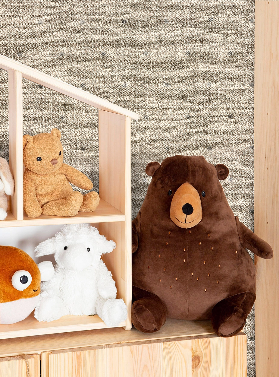 Цветовая гамма в бежевых тонах придаст помещению легкость и свежесть. Дизайн с горошком на рогожке Happy Bunny добавит нотку игривости и оригинальности. Раппорт 64 позволит создать ровный и гармоничный рисунок на стенах, что придаст интерьеру завершенный вид.